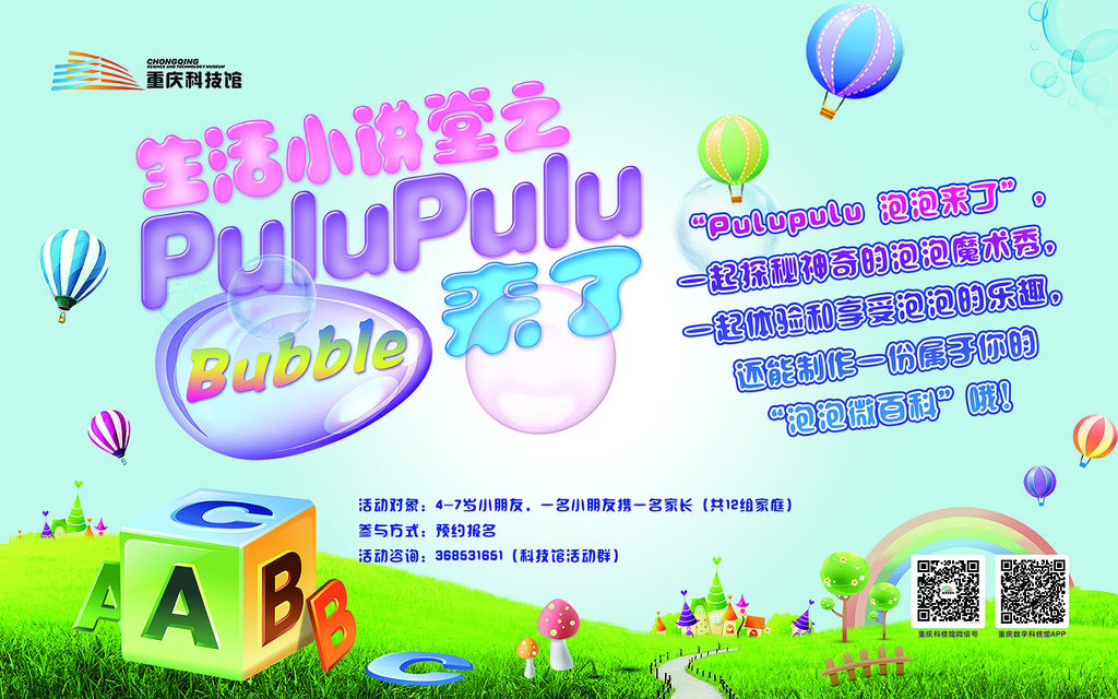吹出一串彩色泡泡,看着它们越飘越高。古灵精怪彩色泡泡,握不住它们想要逃。孩子都想把它拥抱,够不着多想快快长高。快来重庆科技馆和我们一起玩泡泡吧!