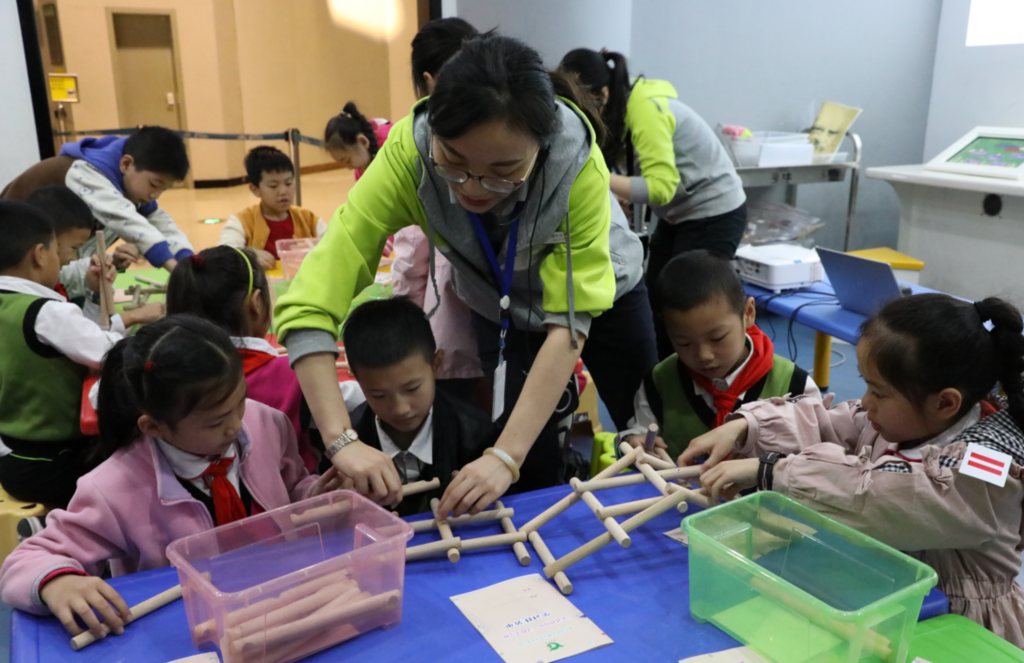 科技辅导教师辅导同学们搭建达芬奇悬浮桥