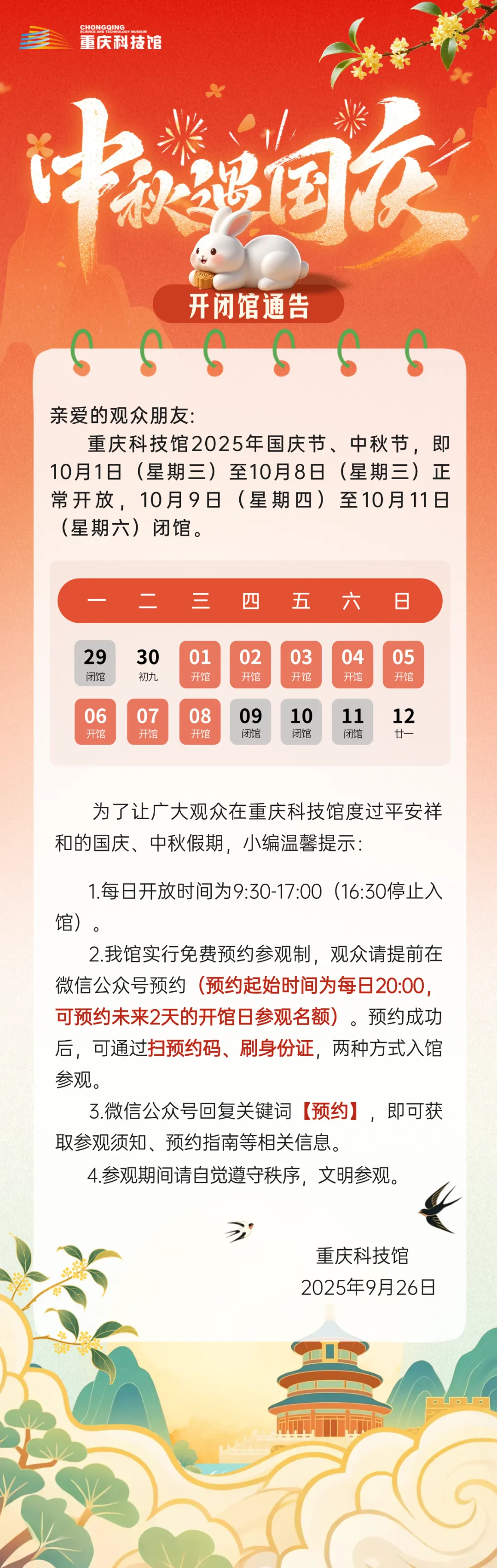 重庆科技馆2025年国庆节、中秋节开馆通告